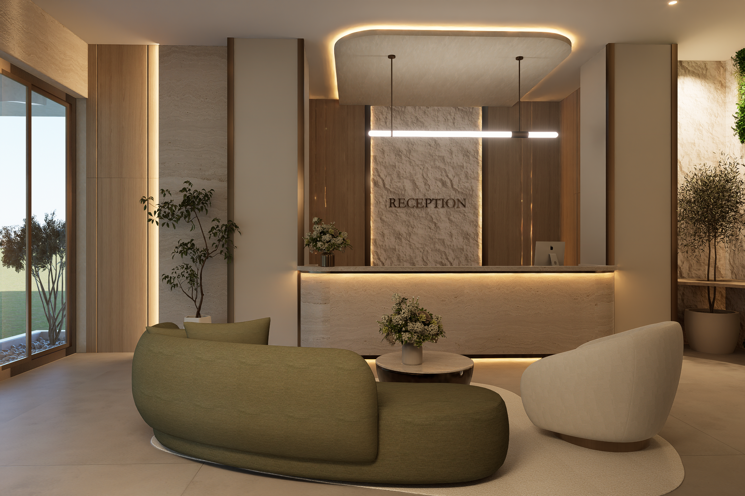 This hospitality project is conceived as a refined, immersive retreat where architecture, nature, and wellness converge into a seamless experience. The design language is rooted in warmth, softness, and organic minimalism, combining natural stone textures, wood finishes, and ambient lighting to create a serene yet sophisticated atmosphere.
