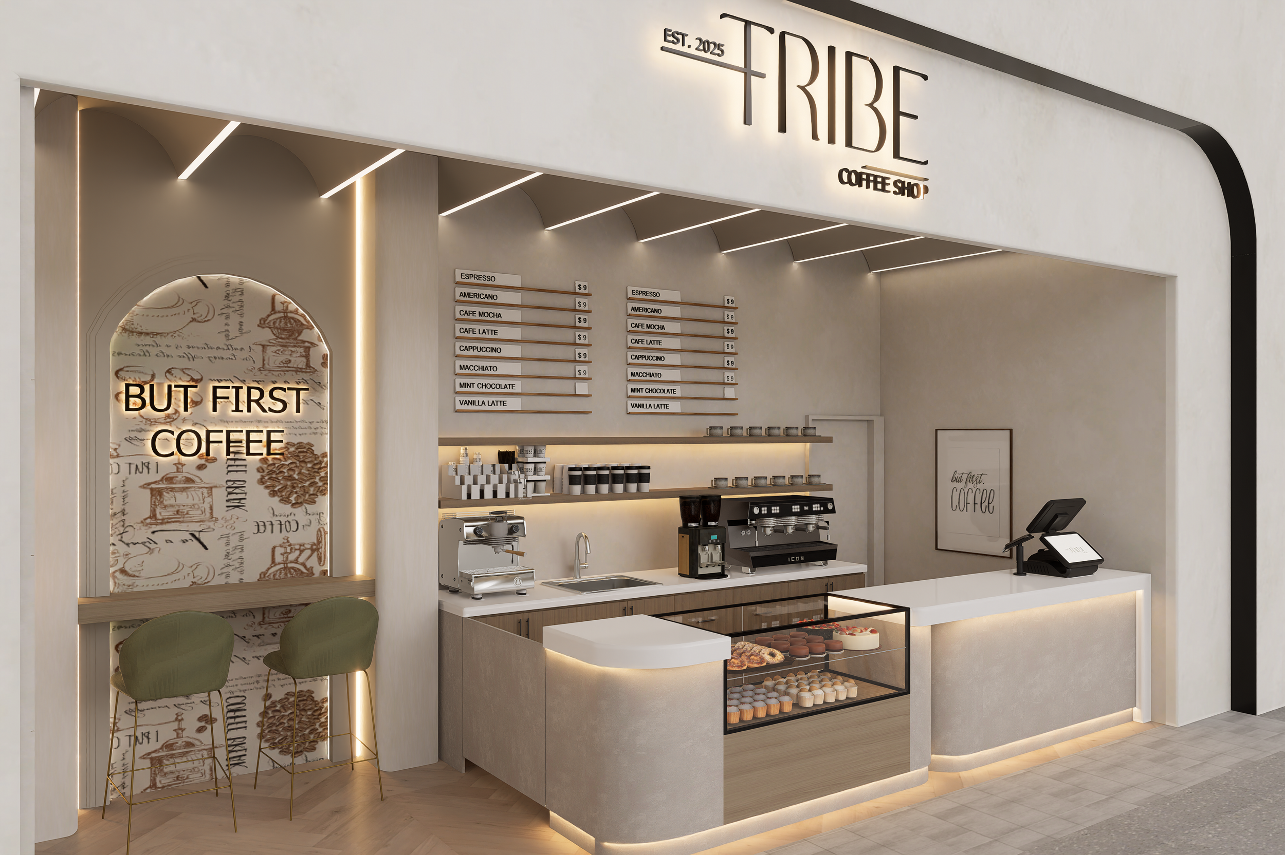 Located in the heart of one of Abu Dhabi’s premier shopping destinations, TRIBE Coffee Shop represents a masterclass in modern, minimalist retail design. This project blends a sophisticated Wabi-Sabi aesthetic with contemporary luxury, utilizing a palette of warm, earthy tones like sandstone, cream, and soft timber to create a welcoming oasis amidst the mall’s bustle.